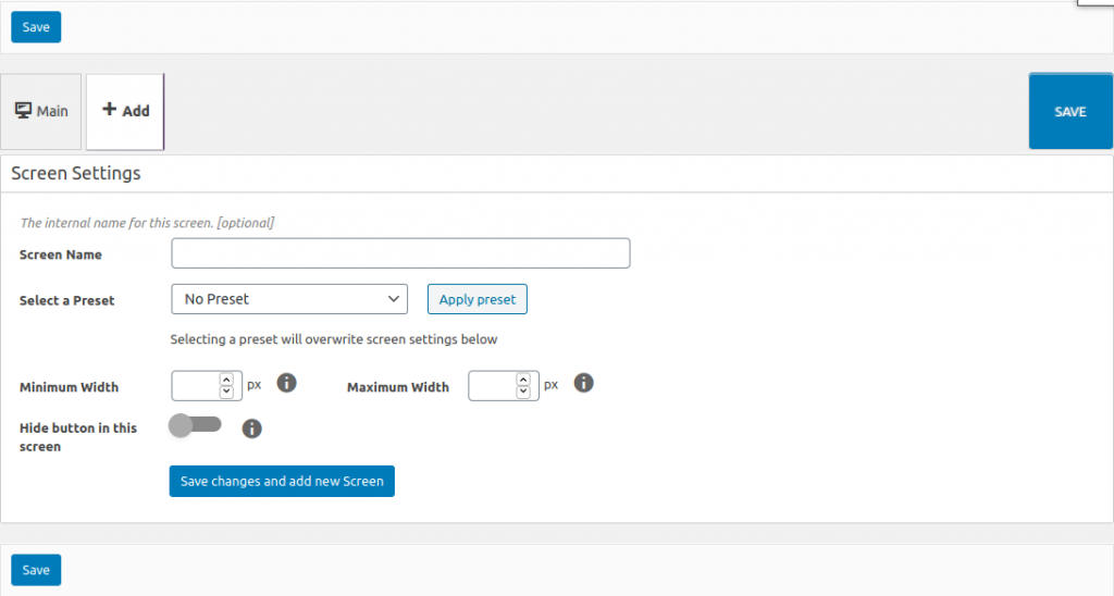 After you created the main design for your button, you can change the styling of this button by adding a responsive screen. This can be done in the button editor by clicking on the Add Tab on top. This will show you several options.