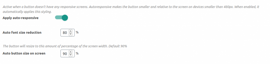 By default, when no responsive screens are created the plugin will apply two changes to the button when views on mobile devices smaller than 480 pixels. This usually covers many cases. Font size reduction: Will reduce the font size this X percentage of original. So if the button font is 20 pixels, on the responsive screen it will be 16 pixels. Auto Button size on screen: Will make the button relative to the screen or container size. Default is 90%, which is almost the full screen size. Note: While this is a good starting point for many buttons, this is maybe not the case for all. If you create a responsive screen for a button in the button editor, these options will no longer be applied.