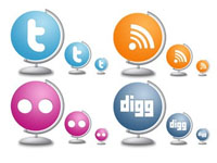 Free Icons published by Face GFX: 8 Globe shape social networking icons set in PNG – 3 size variations – facebook, twitter, rss, vimeo, flickr, digg, technorati and delicious.